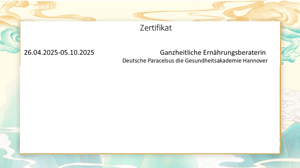Seit 2025 habe ich meine ganzheitliche Ausbildung zur Ernährungsberaterin an der Paracelsus Schule erfolgreich abgeschlossen.